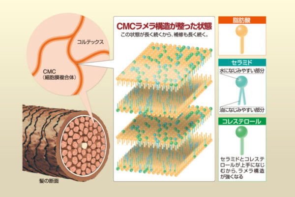 髪の骨格には、ケラチン骨格とCMC骨格(ラメラ構造ともいう)があります。